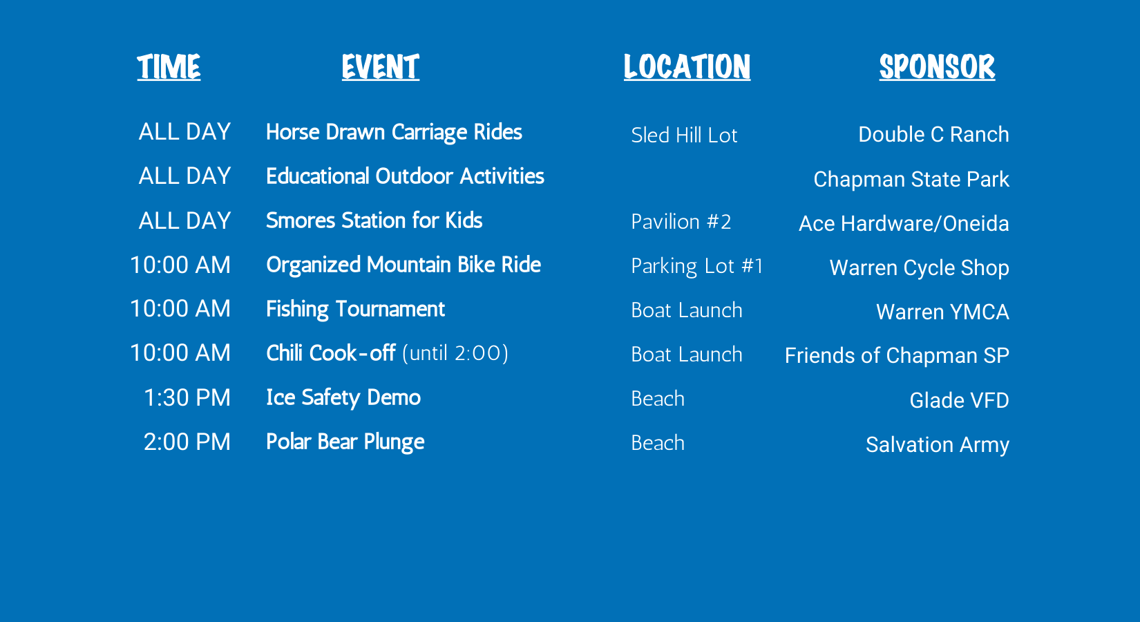 Registration sheets for the fishing tournament, cardboard sled dog races, & polar plunge will be made available at the event.